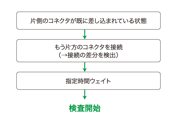 ワーク接続時、タイムオーバーによりNGが発生した際、STANDARDモードでは一度両側のコネクタを引き抜く必要があります。作業時に片側のコネクタを差し込む際、タイムアウトした場合でも、片側のみ挿し直すことで再検査スタートが可能となります。