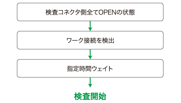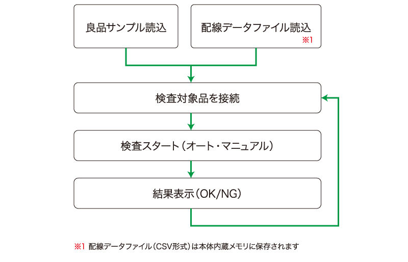 検査方法は、まず正解となるデータの設定から開始します。良品サンプルの読み込み、もしくは配線データファイルのロードの2つの方法から選択可能です。次に検査対象品(ワーク)を接続して検査を実行します。本機では検査スタートをオート・マニュアルのいずれかを選択可能です。オートスタート選択時、ワークの繋ぎ替えを自動検知して検査をスタートします。